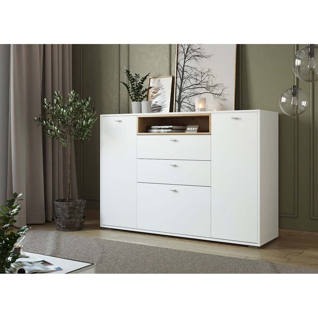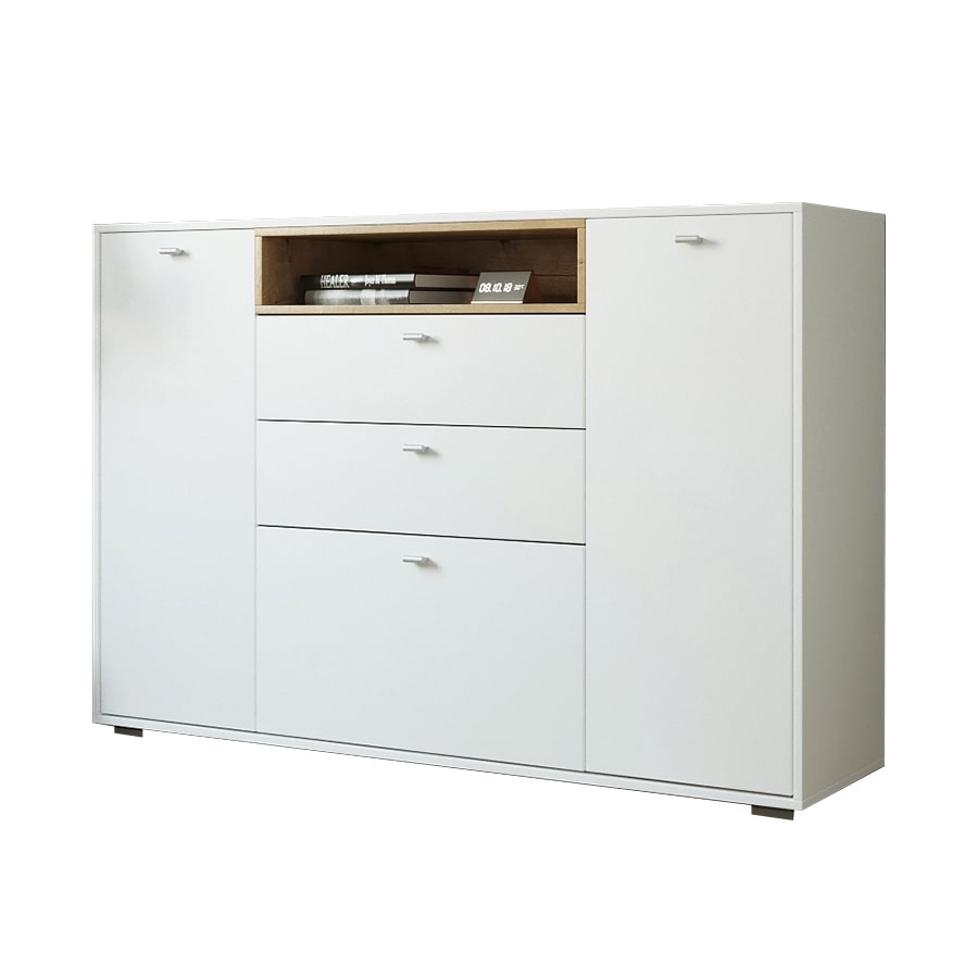 Комод выполнен в белом цвете, что позволяет ему гармонично вписаться в любой интерьер. Материал корпуса и фасада - ЛДСП, что обеспечивает прочность и долговечность изделия.