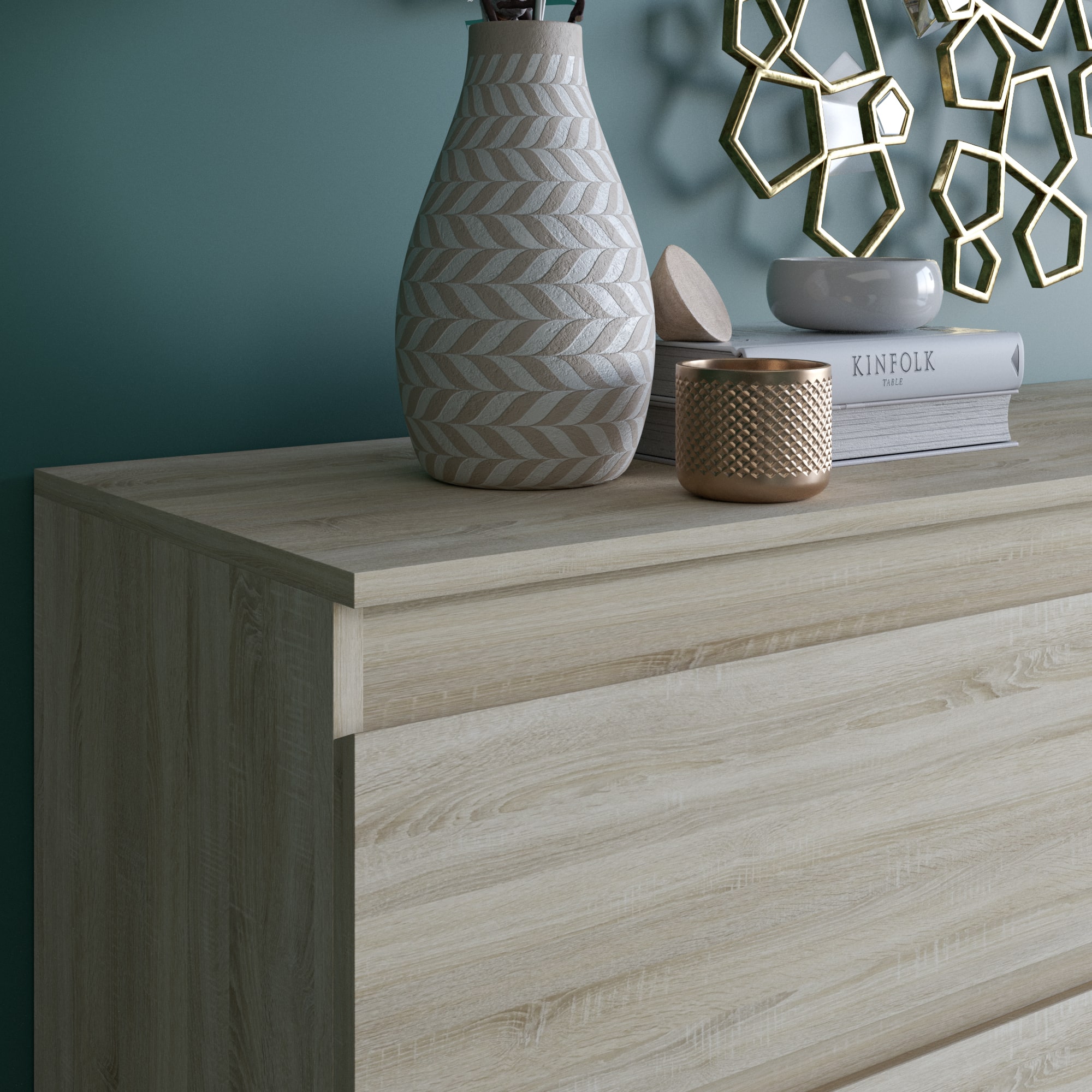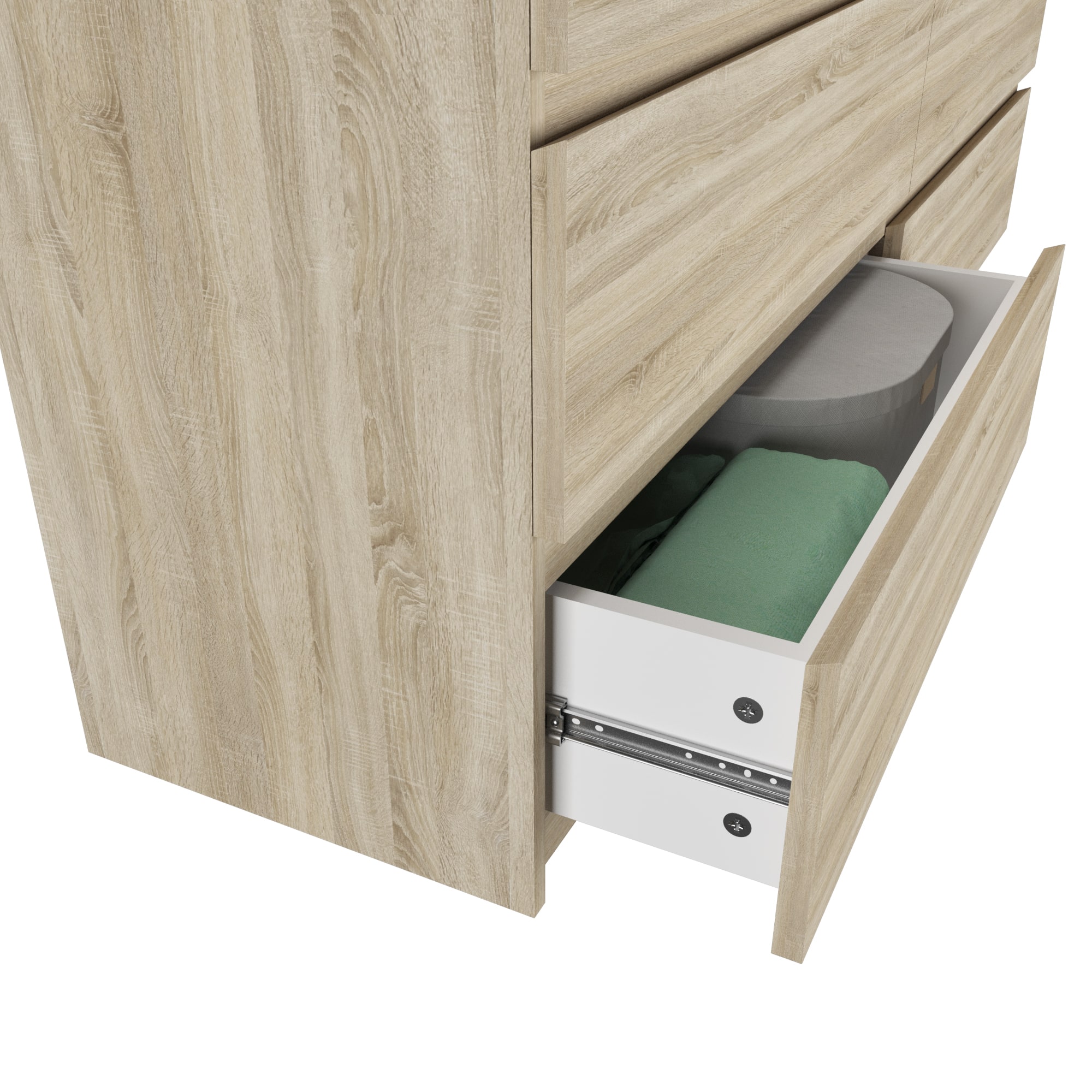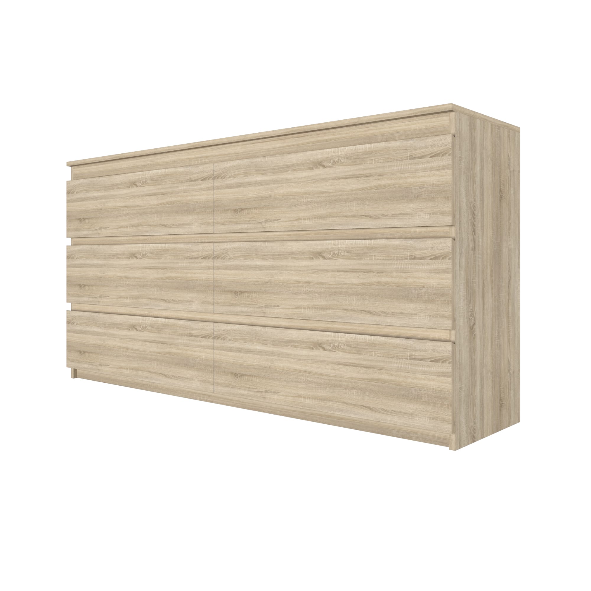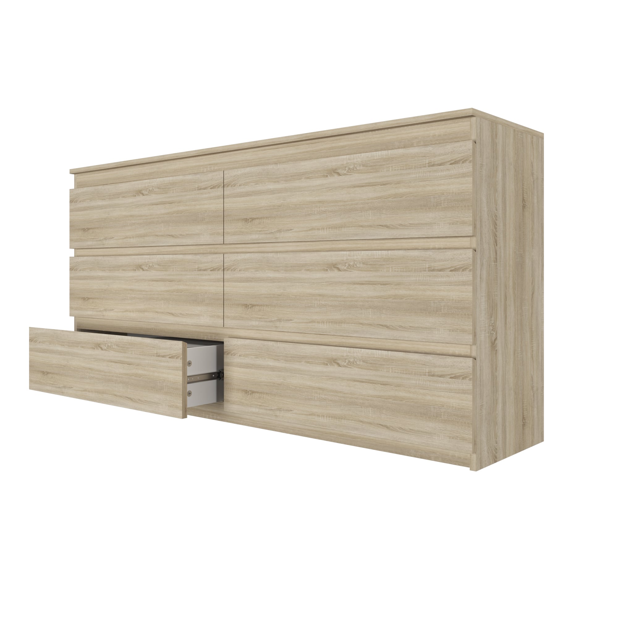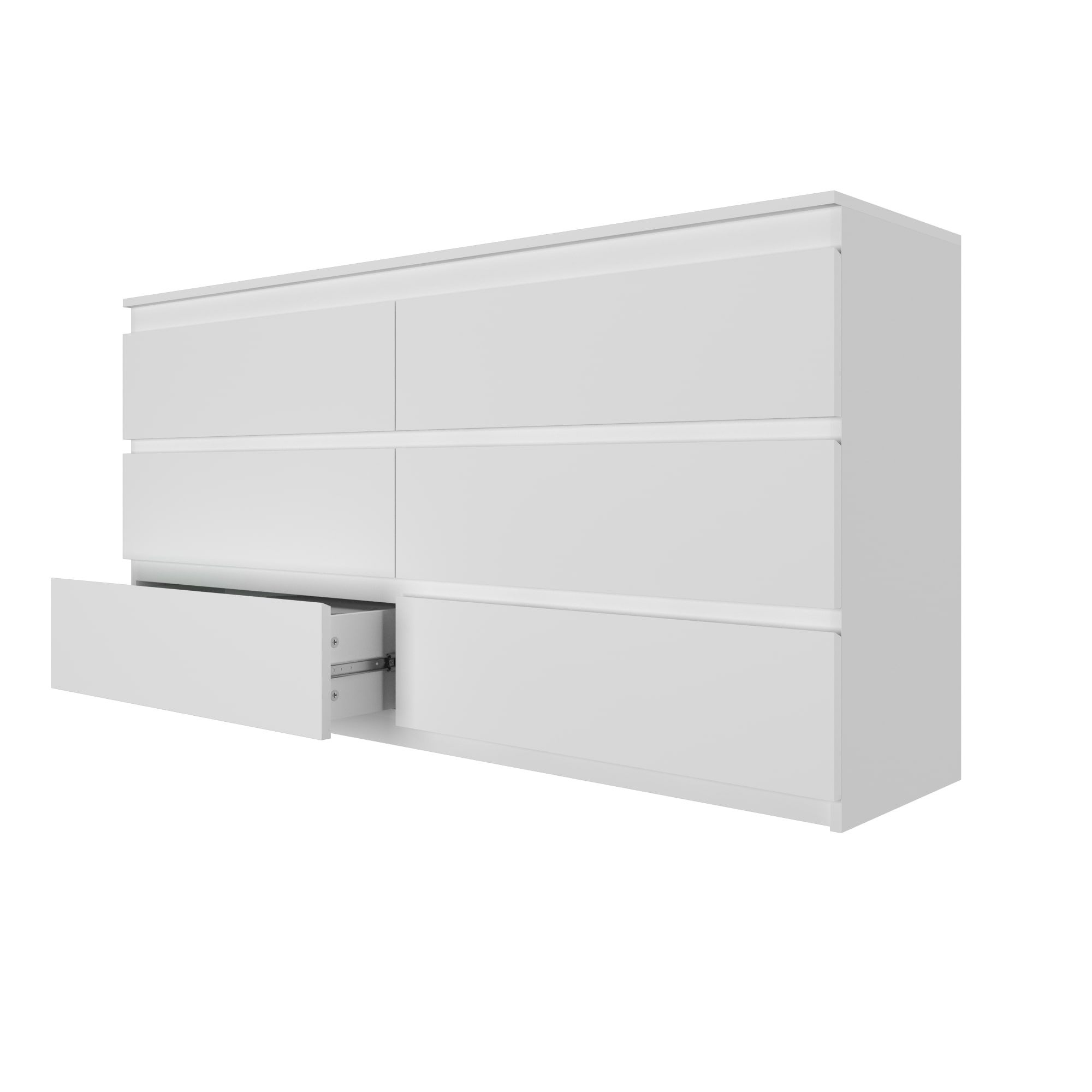 Комод имеет 6 ящиков, что обеспечивает достаточное пространство для хранения различных предметов. Шариковые направляющие обеспечивают плавное и бесшумное открывание ящиков.
