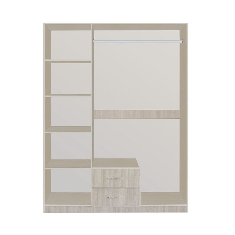 Внутри шкафа расположены три двери и два ящика, что обеспечивает удобное и эффективное использование пространства. Три двери позволяют разделить внутреннее пространство шкафа на две секции, что позволяет хранить одежду разных видов и размеров.